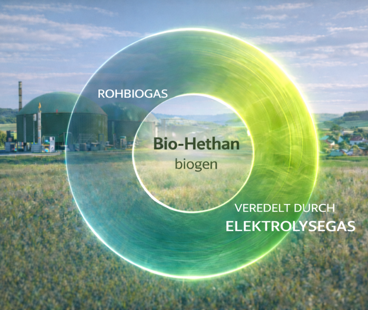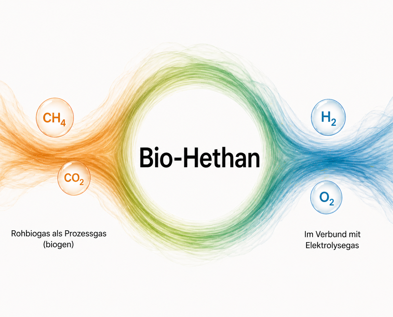 Für die Bio-Hethan-Erzeugung wird entschwefeltes Rohbiogas direkt aus dem Fermenter genutzt. Eine Aufbereitung zu Biomethan ist nicht erforderlich, da es durch Elektrolysegas zu einem effizienteren, sauberer brennenden Hybridgas veredelt wird. Der Einsatz erfolgt dezentral und unabhängig vom Gasnetz.
