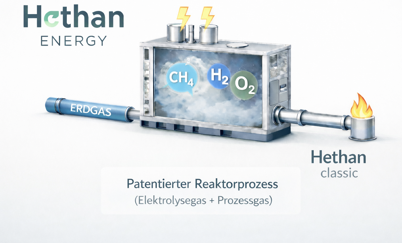 Hethan Classic kombiniert einen definierten Anteil eines fossilen Prozessgases (z. B. Erdgas) mit elektrolytisch erzeugtem Wasserstoff und Sauerstoff zu einem stabilisierten Hybridgas. Der im Hethan enthaltene Sauerstoffanteil ist wesentlich höher als in klassischen Hybridgasen, was zur deutlichen Optimierung von Verbrennungsprozessen in Verbindung mit Wasserstoff und Methan führt. Die Flamme wird heißer und stabiler, der Brennstoff wird vollständiger umgesetzt und die Emissionen sinken spürbar.