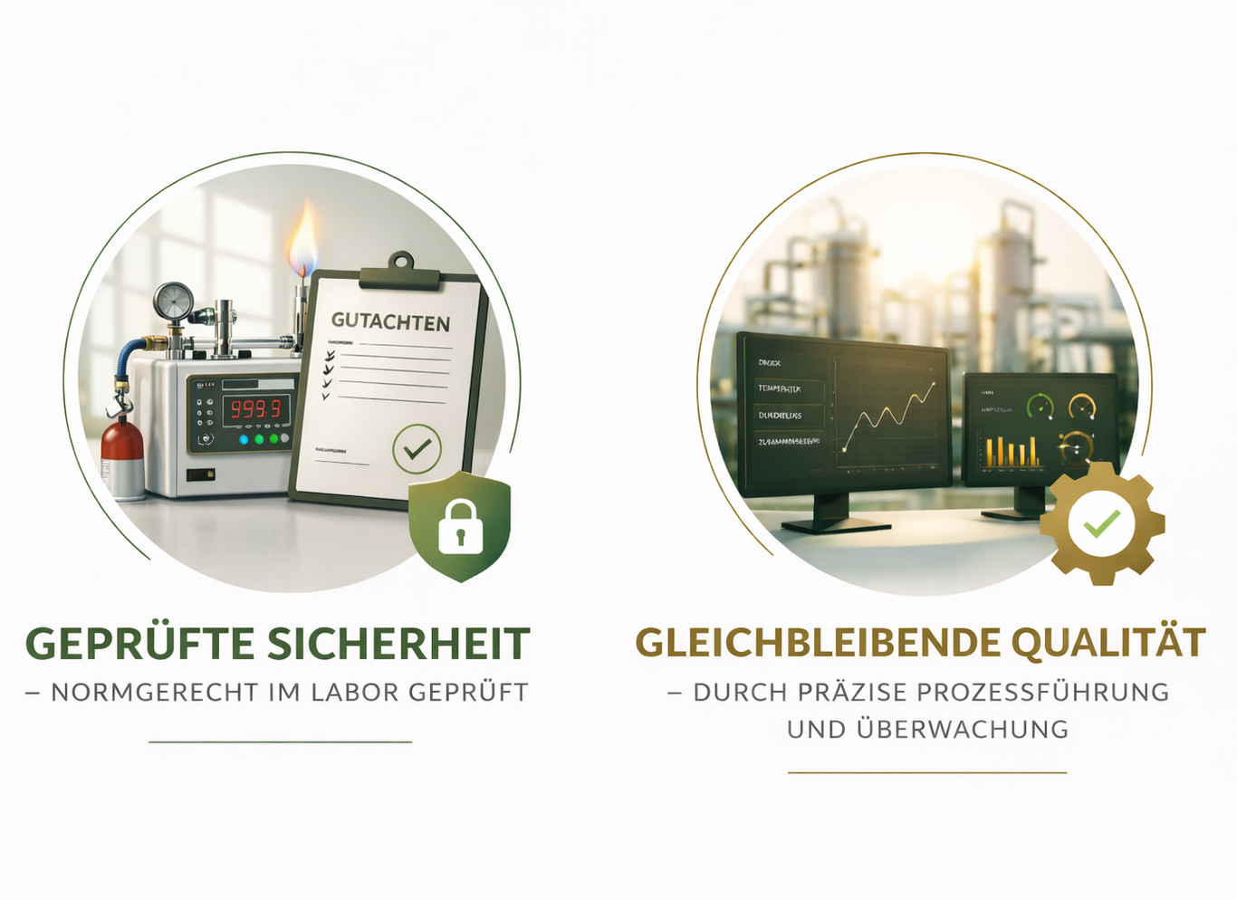 Mit unserer Technologie gehen wir einen anderen Weg: Wir geben ein Prozessgas in ausreichender Menge ins System, was das resultierende Hethangas stabilisiert und zusätzlich Energie liefert. Die Gaszusammensetzung für eine sichere praktische Handhabung wurde in einem anerkannten Labor normgemäß ermittelt.